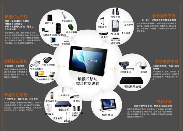 智能家居系统让您轻松享受生活。出门在外,您可以通过电话、电脑来远程遥控您的家居各智能系统,例如在回家的路上提前打开家中的空调和热水器;到家开门时,借助门磁或红外传感器,系统会自动打开过道灯,同时打开电子门锁,安防撤防,开启家中的照明灯具和窗帘迎接您的归来;回到家里,使用遥控器您可以方便地控制房间内各种电器设备,可以通过智能化照明系统选择预设的灯光场景,读书时营造书房舒适的安静;卧室里营造浪漫的灯光氛围……这一切,主人都可以安坐在沙发上从容操作,一个控制器可以遥控家里的一切,比如拉窗帘,给浴池放水并自动加热调节水温,调整窗帘、灯光、音响的状态;厨房配有可视电话,您可以一边做饭,一边接打电话或查看门口的来访者;在公司上班时,家里的情况还可以显示在办公室的电脑或手机上,随时查看;门口机具有拍照留影功能,家中无人时如果有来访者,系统会拍下照片供您回来查询。